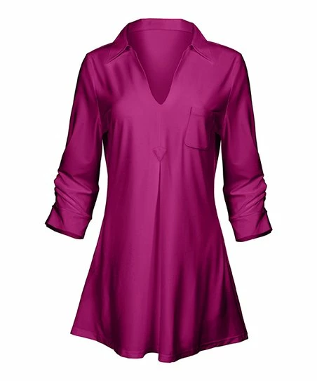 With three-quarter sleeves, chest pocket and stretch-infused fabric, this collared v-neck tunic completes any look.