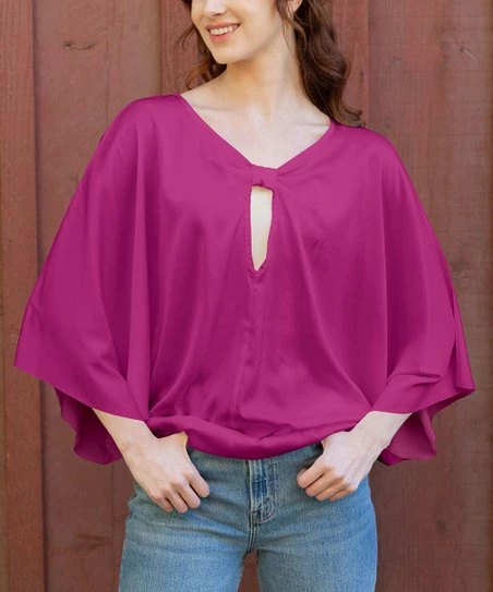 An ultra-flowy satin tunic designed with dolman sleeves and a keyhole accent on the chest.
