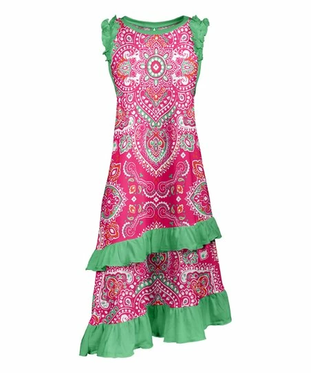 Elegant ruffles add texture to this midi dress with an asymmetrical hemline.