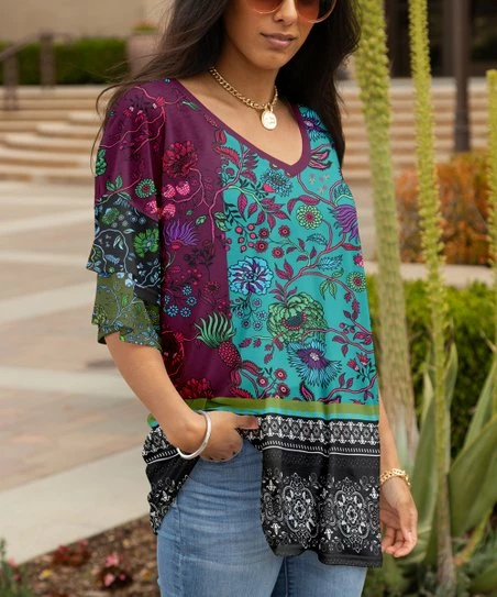 Framed by layered ruffle sleeves, this boldly patterned tunic adds dimension to your weekend ensembles. V-neck and stretch knit.