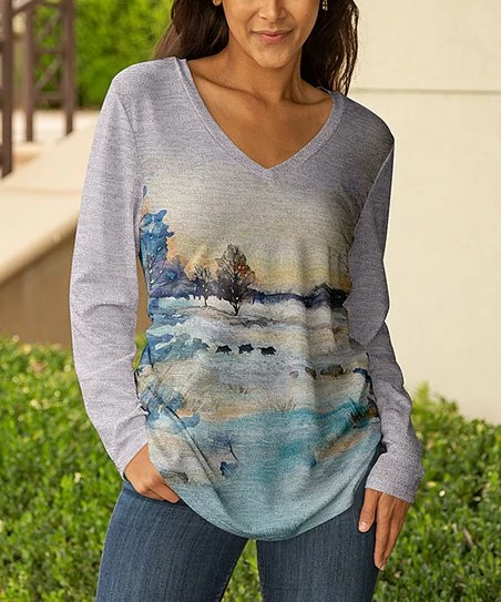 This v-neck top offers a stretch-infused fabric and a loose fit for all-day comfort.