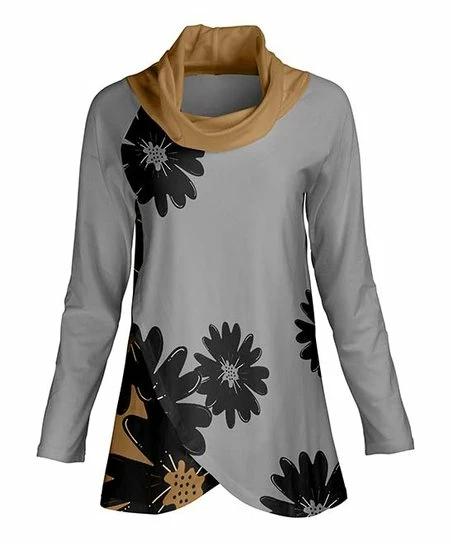 Lily | Gray & Beige Floral Tulip-Hem Cowl Neck Tunic – Plus