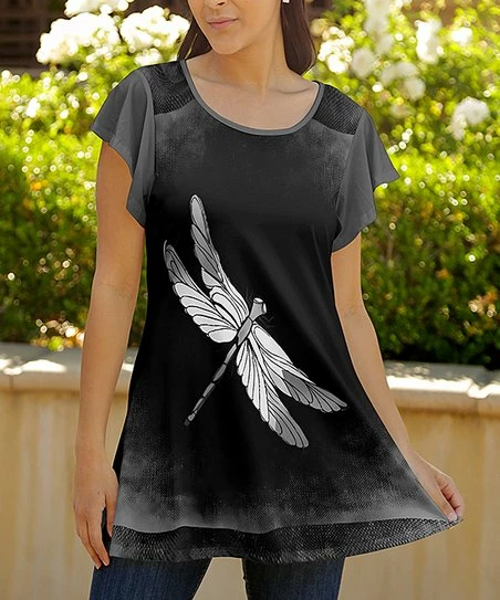 This tunic has a scoop neck and ruffle sleeves with an extended hemline.