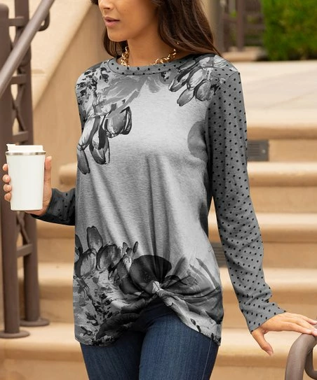 A stylish twist-front design, a bold print and a hint of stretch make this tunic a great addition to any outfit.