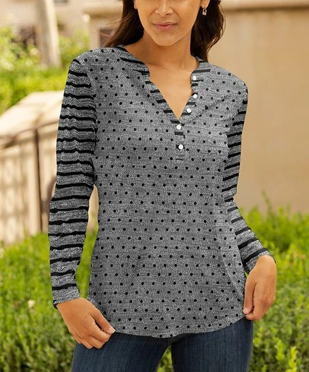 This long-sleeve tunic is designed with a notch neckline and stretch-infused fabric.