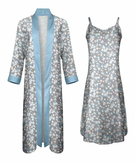 - Includes gray and blue floral nightgown and gray and blue floral robe (two pieces total)