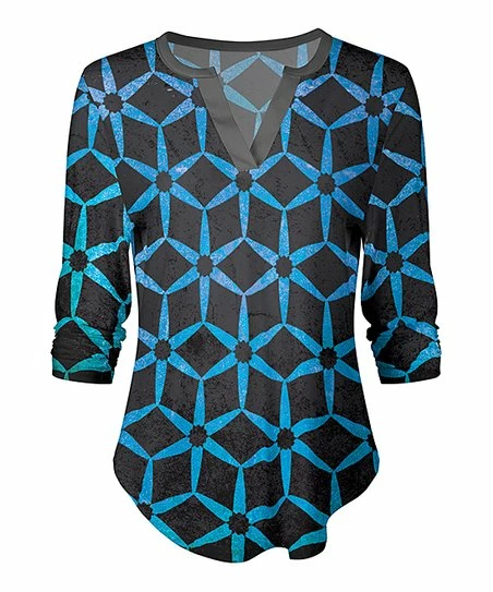 Expand your casual rotation with this bold-patterned tunic styled with a crisp notch neckline and stretchy fabric for added comfort.