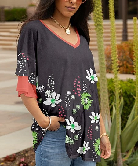 Enjoy extra coverage with the double-tier sleeves on this v-neck tunic featuring lightweight fabric infused with stretch.