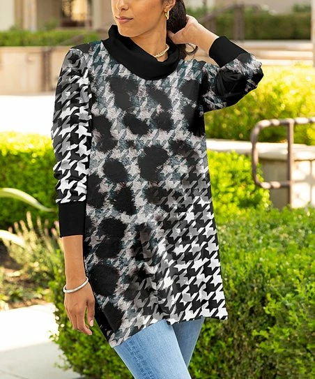 Score just the right amount of coverage on mild days with this boldly patterned tunic that combines a cozy draped cowl neck with three-quarter sleeves.