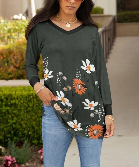 Play with prints by adding a fresh new one to your wardrobe with this flattering v-neck tunic featuring a hint of stretch and sporty raglan sleeves.