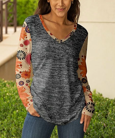 This tunic features a V-shaped neckline and floral motif. Crafted from a stretch blend for flexible comfort.