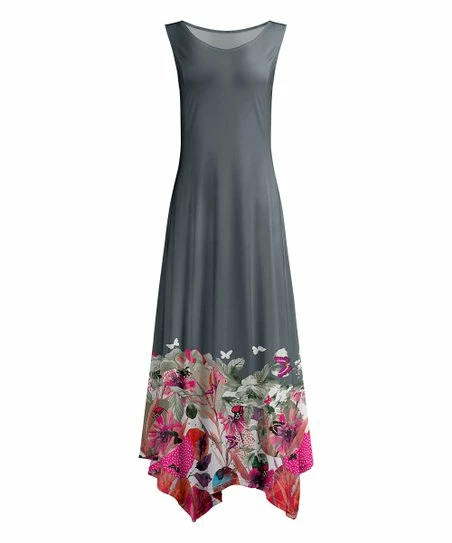 Add flowy comfort to your sunny day rotation with this lively maxi dress crafted with a handkerchief hem and stretch-enhanced fabric.