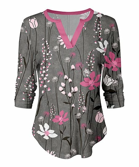 Welcome a pop of print atop your go-to leggings and skinny jeans with this tunic crafted with three-quarter sleeves and a notched neckline.