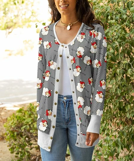 Create a casual layered look with this lightweight cardi expressing a vibrant seasonal print and convenient snap closures.