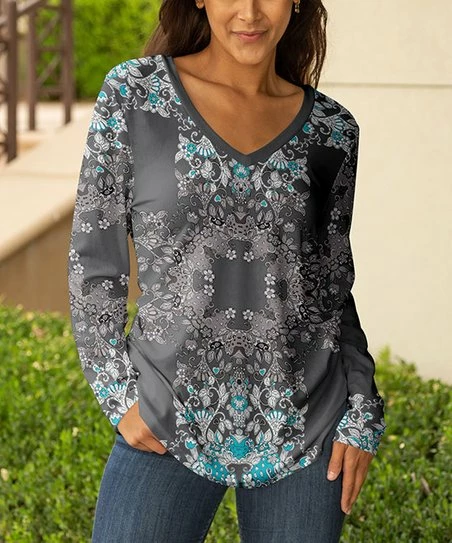 Tunic featuring a jewelry-friendly v-neck design and stretch-infused fabric.