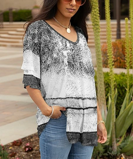 Liven up your wardrobe with this fun stretch-infused tunic featuring layered trumpet sleeves and a flattering v-neckline.