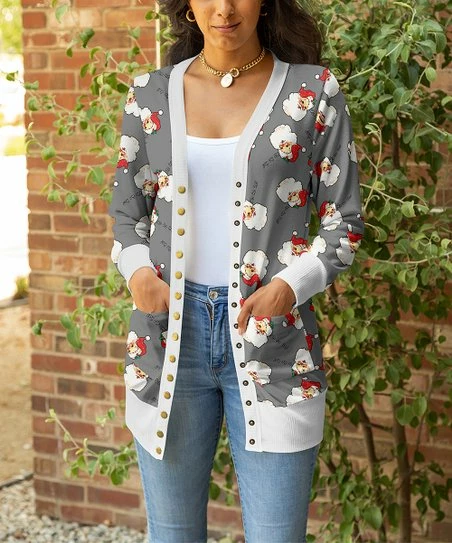 This cardigan features snap-button closures, convenient pockets and a bold print.