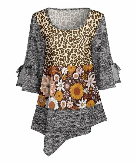 This graceful asymmetric-hem tunic features a scoop neck and a vivid print. Three-quarter sleeves show off tied slit cuffs.