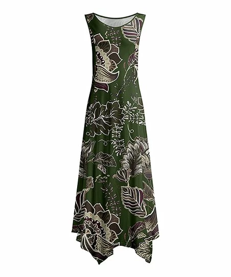 This maxi dress features a breezy handkerchief hem and vibrant floral pattern.