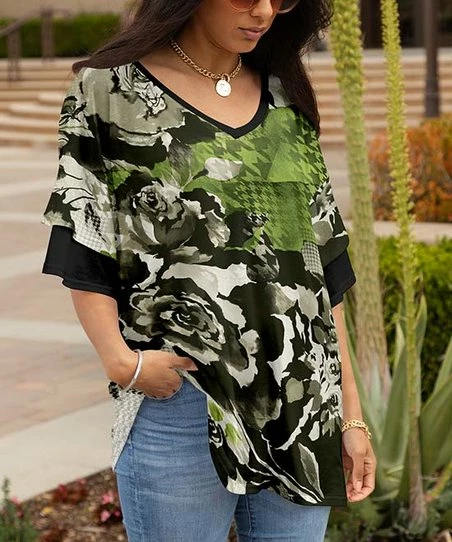Ruffled accents lend lively expression to this curve-skimming tunic that sports an angled neckline for feature-flattering flair.