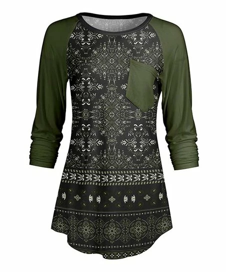 Lily | Green & Black Scarf-Print Chest-Pocket Raglan Tunic – Women