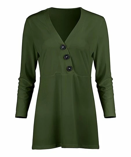 A button-accented surplice design lends charming flair to this long-sleeve tunic featuring a versatile solid hue and touch of stretch for lasting comfort.