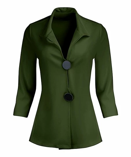 Bold buttons and cropped sleeves lend contemporary appeal to this stretch-enhanced blazer boasting a versatile solid hue.
