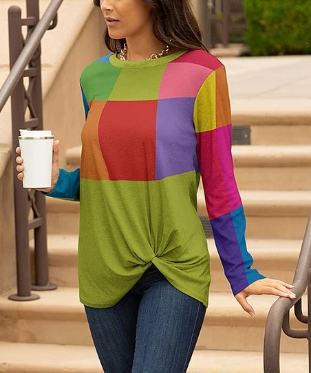 Long-sleeve tunic featuring a flattering twist accenting the hem and stretch-blend material for extra flexibility.