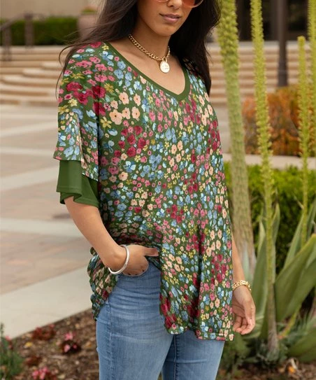 A contrasting layer on the half-length sleeves add dimension to this v-neck tunic.