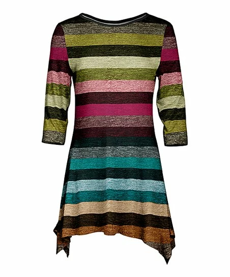 Set modern style in motion with this allover patterned tunic that flows to a sidetail hemline. Three-quarter sleeves make it a great pick for facing shifting temperatures.