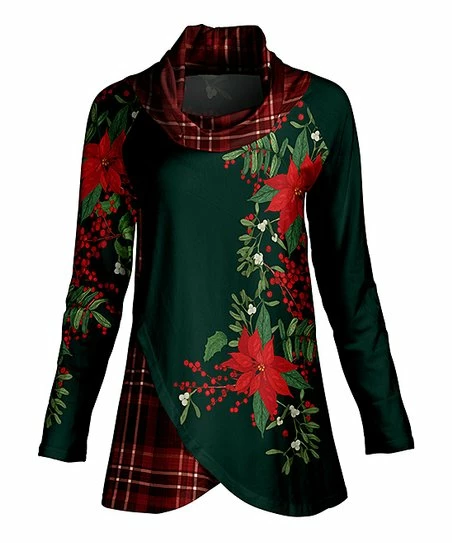 A tulip hem adds a layered illusion to this chic tunic that’s detailed with long sleeves and a cowl neck.