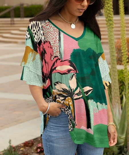 This flowy tunic offers effortless style with a classic v-neck, bold pattern and layered bell sleeves.