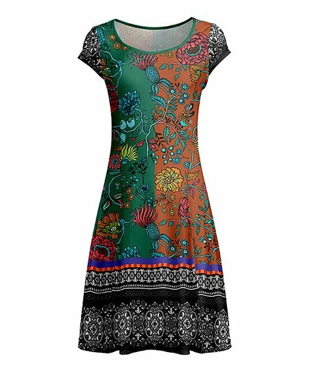 This cap-sleeve dress features a statement pattern and stretch-blend material.
