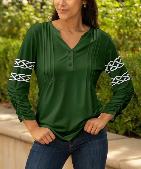 Button-front tunic featuring pleated detailing and stretch-infused fabric.