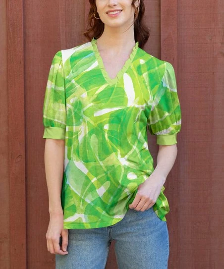 Lily | Green & White Brushstroke Half-Sleeve V-Neck Tunic – Women & Plus