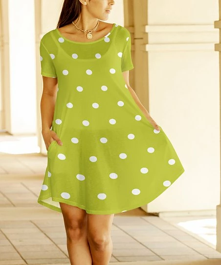 This short-sleeve dress culminates in a swinging skirt that features side pockets.