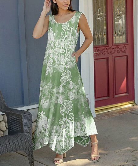 This swingy sleeveless dress keeps it casual with a maxi handkerchief hem, relaxed scoop neck and side pockets.