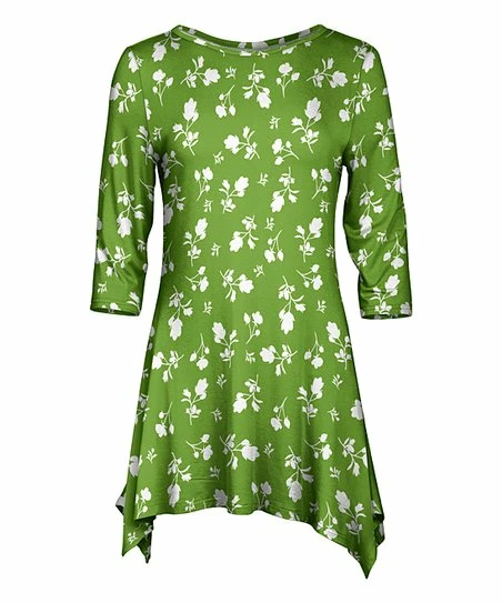 Refresh your wear-everywhere wardrobe rotation with this uniquely patterned tunic featuring stretchy knit fabric and a flowy sidetail hemline. Three-quarter length sleeves offer season-spanning style for maximum pairing potential.
