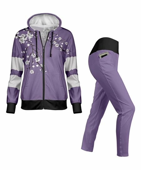 - Includes lavender and black floral stripe hoodie and lavender and black color block leggings (two pieces total)