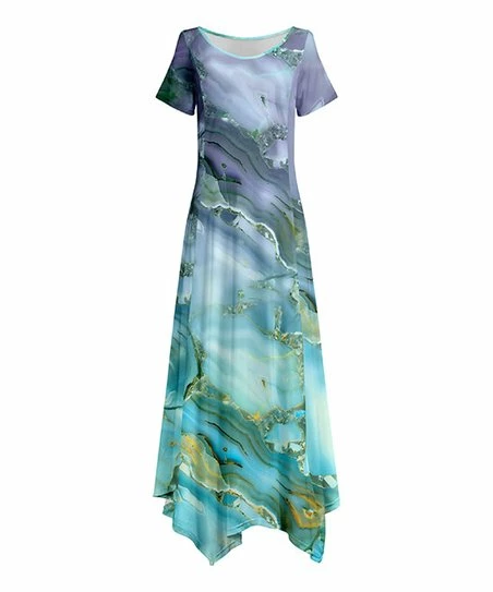 Love the flowy movement you’ll experience with this short-sleeve maxi dress featuring a handkerchief hemline, eye-catching print and stretch-infused fit.
