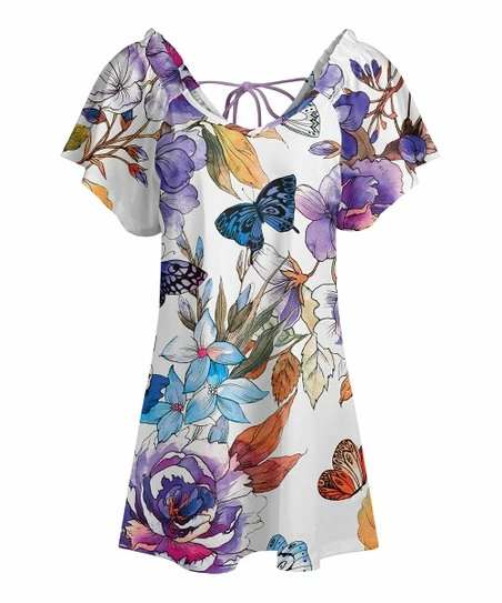 Casual meets fashionable with this nature-inspired tunic sporting short flutter sleeves and a tie-back closure.