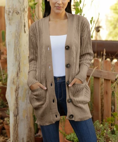 Lily | Light Brown Cable-Knit Pocket Button-Up Cardigan – Women & Plus