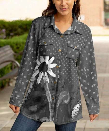 Flowy button-up tunic featuring a vibrant pattern and front pockets.