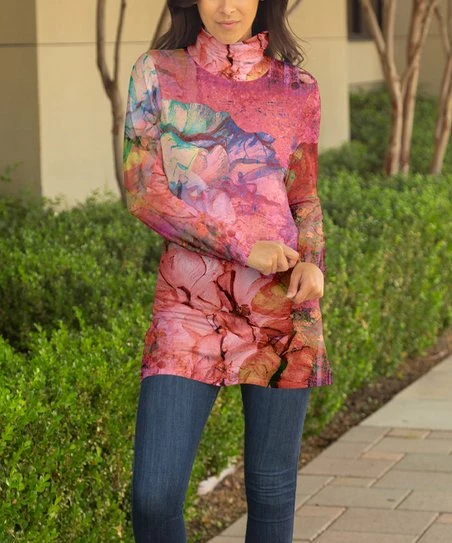 Keep cozy on cooler days with this tunic featuring long-sleeves, a turtleneck and versatile colors and print for easy matching.
