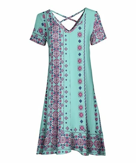 A strappy neckline adds a dash of playful allure to this short-sleeve shift dress that boasts a personality-packed print.