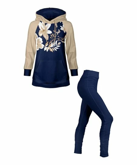 - Includes navy and beige floral pocket raglan hoodie and navy leggings (two pieces total)