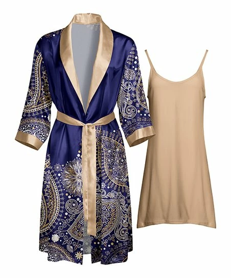- Includes navy and beige floral satin robe and beige nightgown (two pieces total)