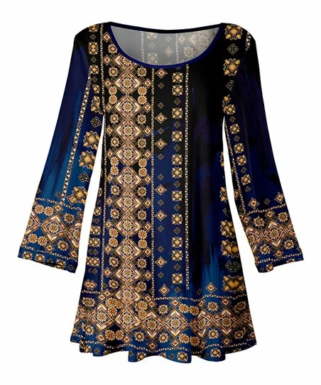 Turn heads as you cruise through the day wearing this scoop neck tunic in a flamboyant print. Three-quarter sleeves strike a coverage compromise for mild days.