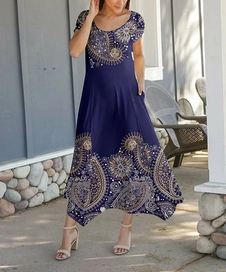 A bold print gets extra excitement when it’s paired with this maxi dress featuring a flowy handkerchief hemline and enough stretch for all-day comfort.