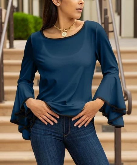 Bring a dash of dramatic flair to your everyday style with this tunic featuring billowing bell sleeves. A dose of stretch in the material promises lasting comfort.